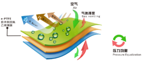 The diameter of the micropores is 0.1-10μm, the molecules of air and water vapor are 0.0004μm, and the pore diameter of the (e-PTFE) membrane is 250-25000 times larger than the diameter of the gas, so the gas can pass through, while the diameter of capillary rain is 500 μm, which is hundreds of times larger than the diameter of the micropores of the mem